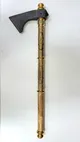 Корпус топора выполнен из дамасской стали, известной своей прочностью и исключительной красотой. Острое лезвие, надежно удерживаемое в рукояти, гарантирует безупречную функциональность. Рукоять изготовлена из благородного дерева, подчеркнута элементом декора из латуни, покрытой позолотой, и украшена натуральными гранатами, что придает изделию неповторимый вид.