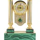 Каждая деталь часов выполнена с исключительным вниманием к деталям. Фигура Святого Георгия Победоносеца, отлитая из бронзы, покоится на постаменте из натурального долерита, шпонированного благородным малахитом (известным своим происхождением из Конго) и латуни, безупречно покрытой золотом (20 мкм высшей пробы) и искусно украшенной ручной гравировкой.